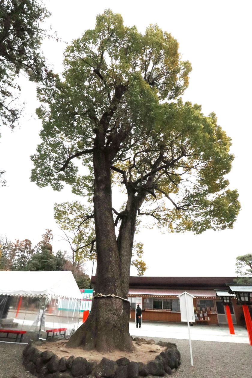 玉村八幡宮の参道わきにあるクスノキの巨木であり、夫婦楠木と呼ばれるご神木である。神社の説明によると植栽後90年程度であるという。立地との適合性と行き届いた管理が感じられる。