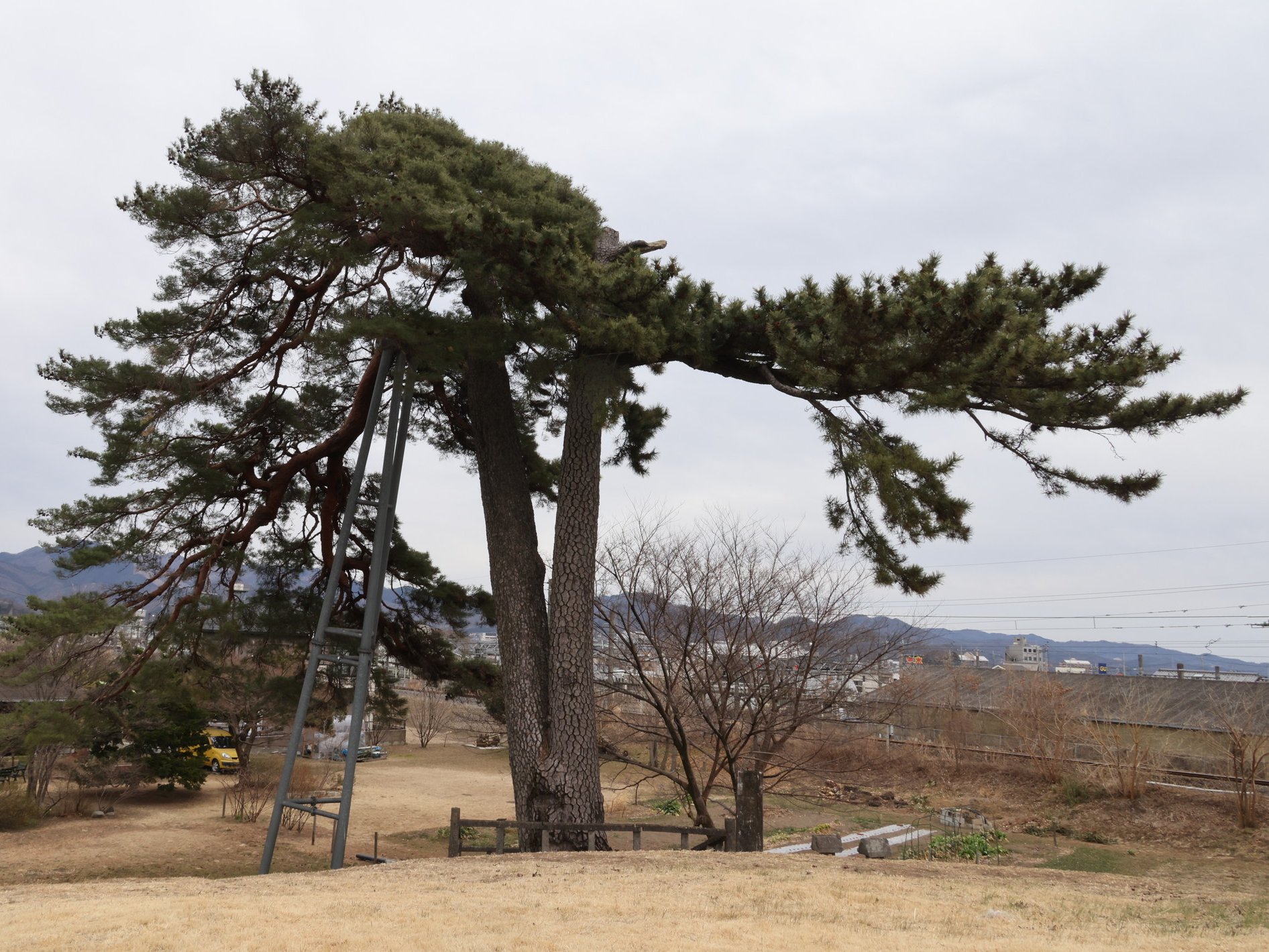 ○アカマツとクロマツが根元で1本になり、完全に癒合し、地上2.25mから上で2本に分かれている。マツではよくある現象で「連理」と言われる。